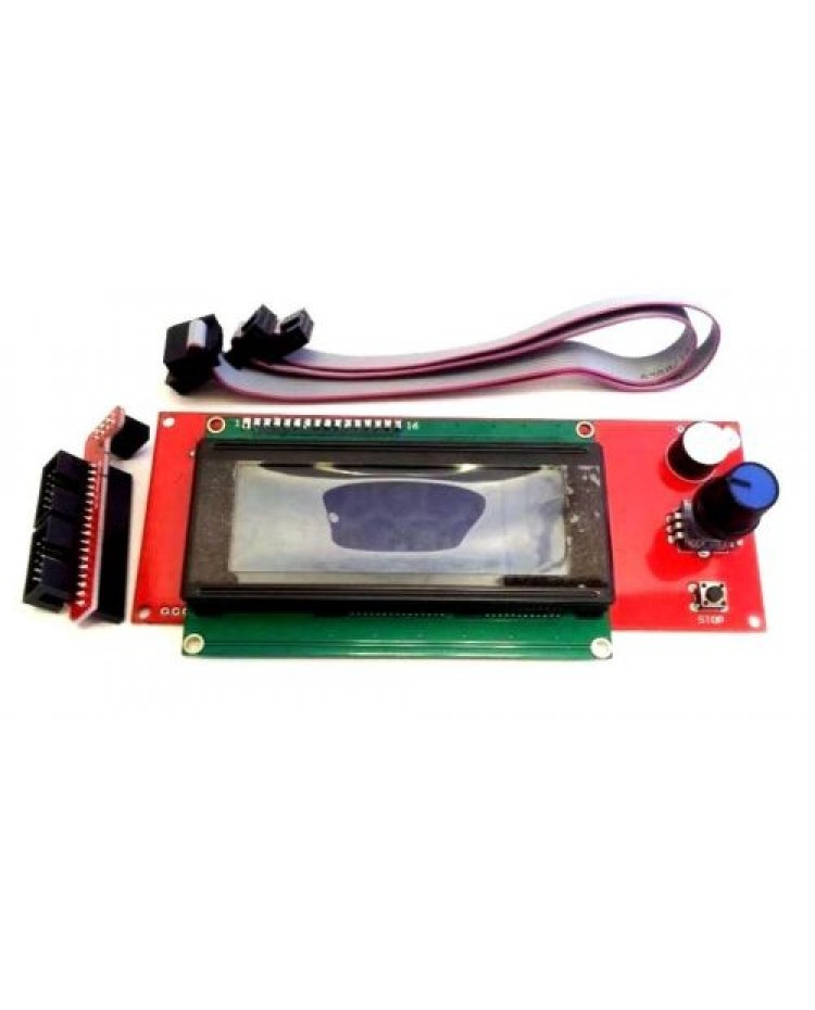 LCD screen with adapter for RAMPS 1.4 controller board. Includes SD card reader, buzzer, stop button, and turnable knob that also acts as a button.